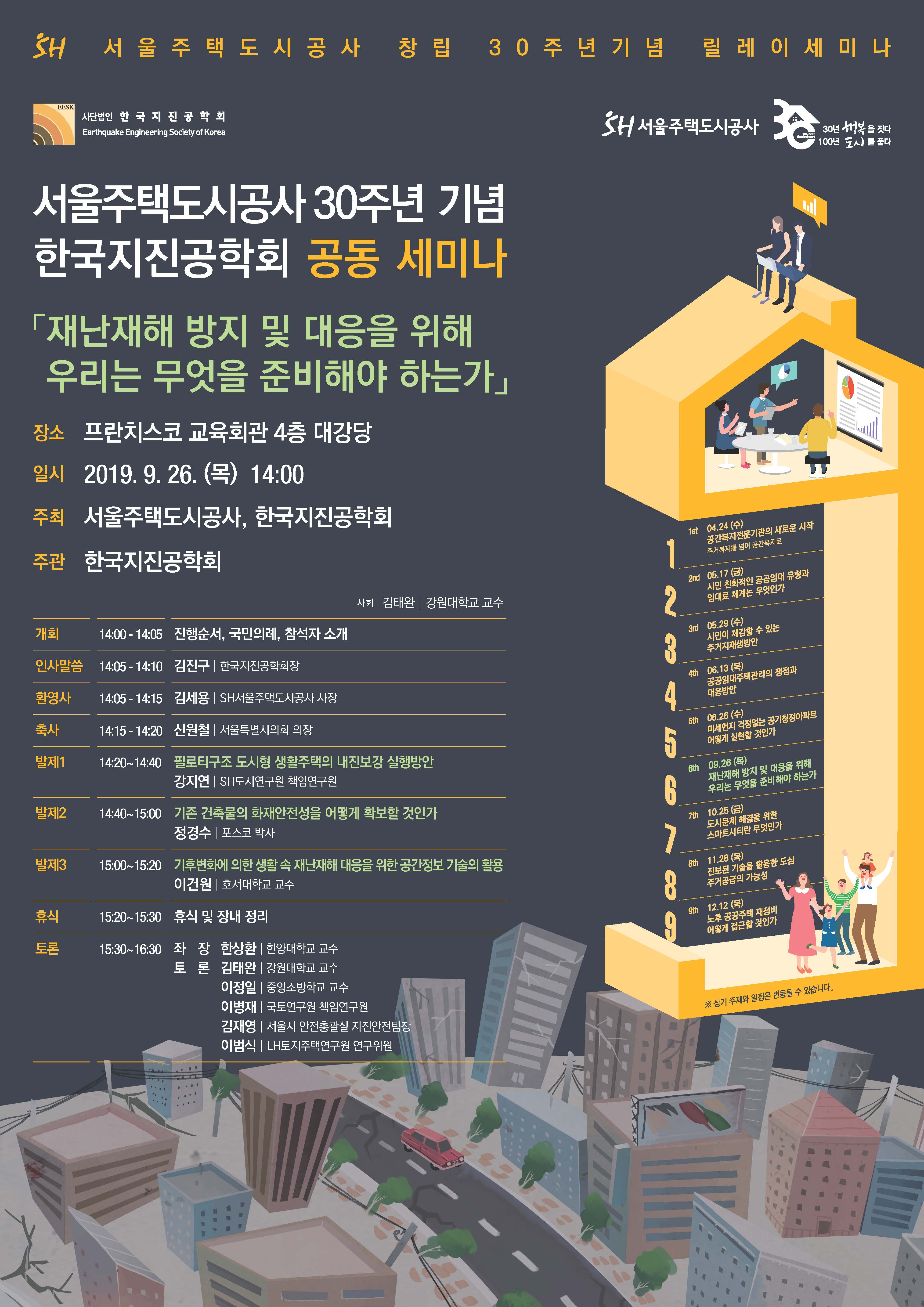 안녕하세요. 회원님 우리학회와 서울주택도시공사가 창립 30주년기념 릴레이 기획세미나를 아래와 같이 개최하게 되어 알려드리오니 회원님들의 많은 참석 부탁드립니다. 1. 일시 : 2019년 9월 26(목) 14:00~16:30 2. 장소 : 정동 프란치스코 교육회관 4층 대강당 3. 주최 : 서울주택도시공사, (사)한국지진공학회 4. 주관 : (사)한국지진공학회 5. 주제 : 재난재해 방지 및 대응을 위해 우리는 무엇을 준비해야 하는가 포스터 :