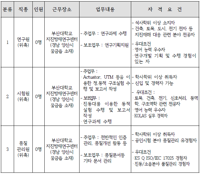 부산대학교 양산캠퍼스 지진방재연구센터에서 [지진안전산업 진흥시설 기반 구축] 사업 수행을 위한 위촉계약직을 채용하고자 하오니 참신하고 의욕 있는 유능한 인재의 많은 지원 바랍니다.